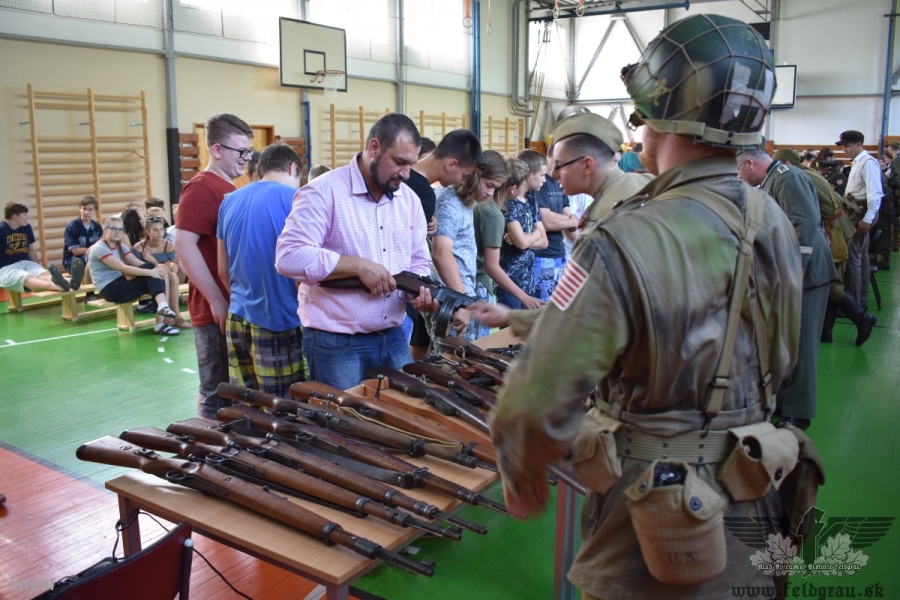 členovia KVH FELDGRAU a KVH VALKÝRA oblečené. Žiaci mohli vidieť americkú